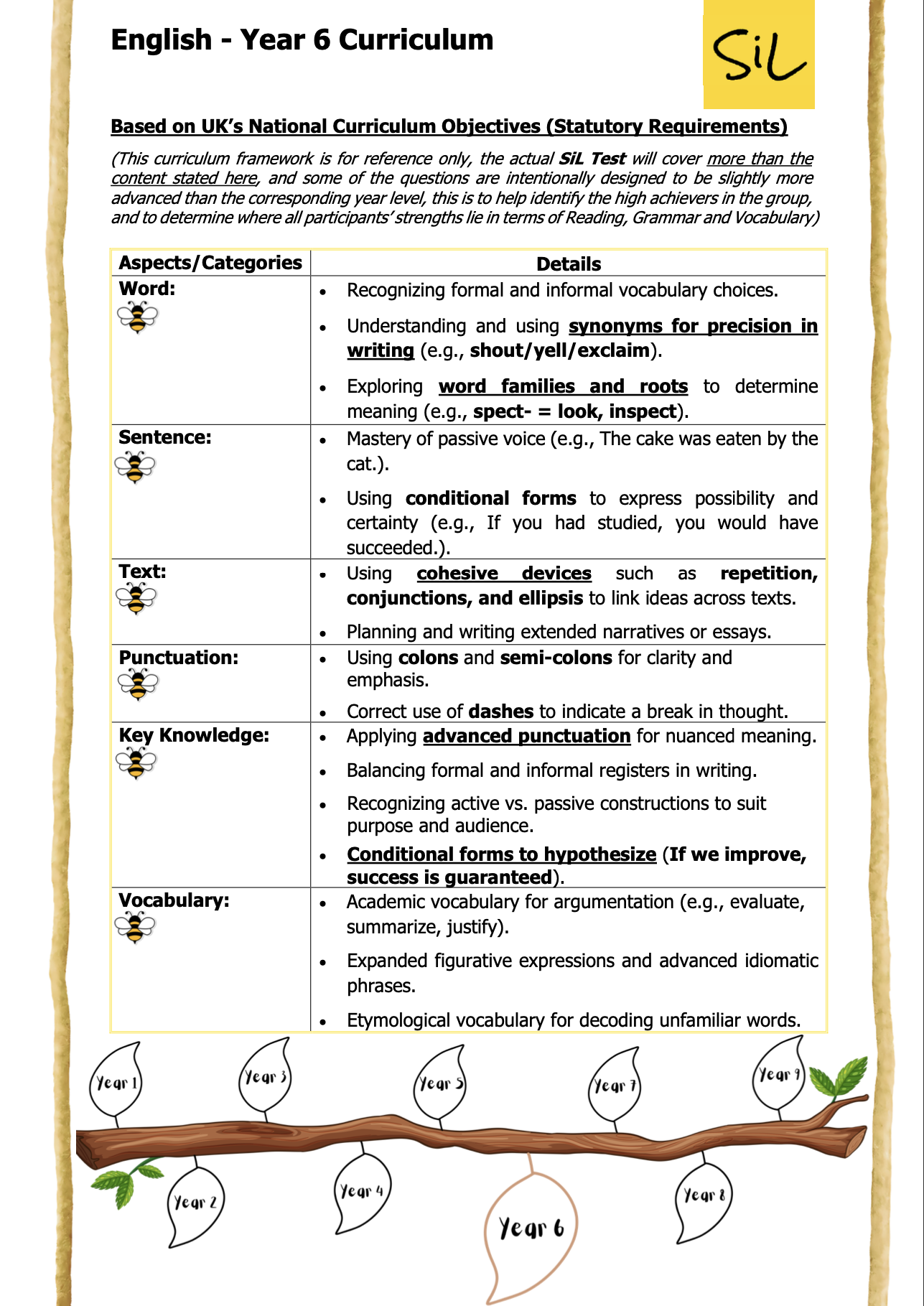 The Year 6 Curriculum Framework and Sample Vocabulary List align with the National Curriculum’s objectives and appendices. It provides a general overview of the English Subject Test content. However, the test will also include some advanced and challenging question types, grammatical items, and vocabulary to better differentiate the abilities and language skills of students at this key stage/year level.