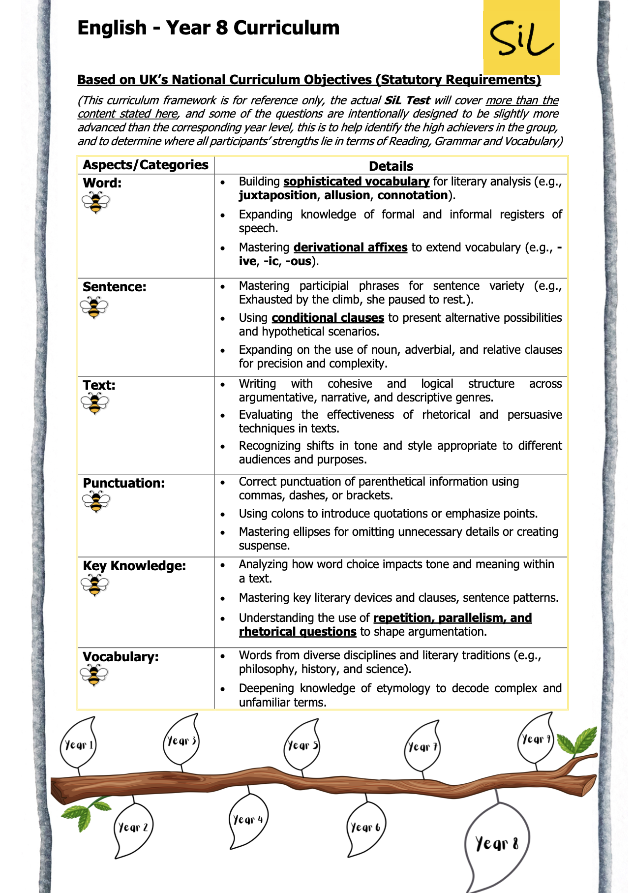 The Year 8 Curriculum Framework and Sample Vocabulary List align with the National Curriculum’s objectives and appendices. It provides a general overview of the English Subject Test content. However, the test will also include some advanced and challenging question types, grammatical items, and vocabulary to better differentiate the abilities and language skills of students at this key stage/year level.