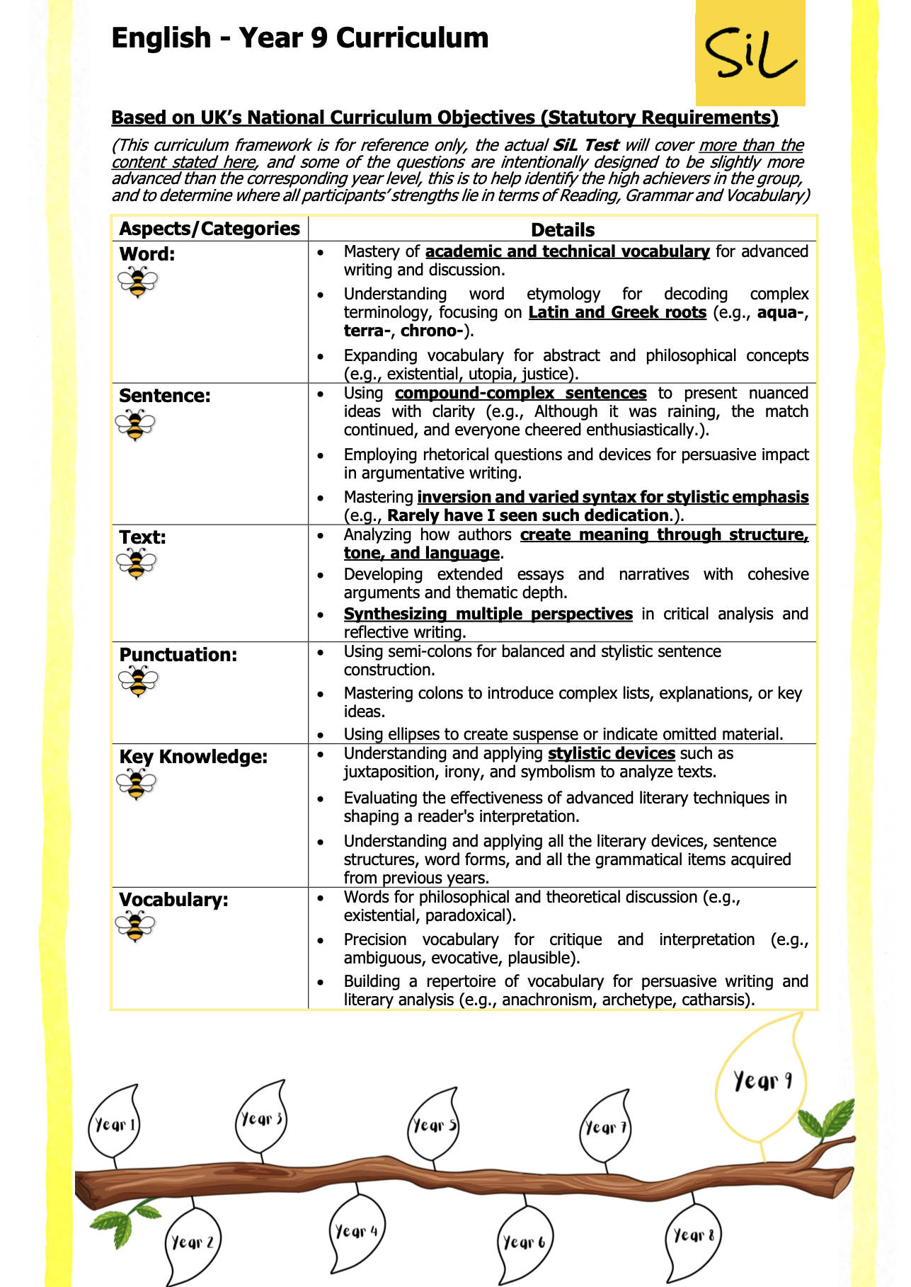 The Year 9 Curriculum Framework and Sample Vocabulary List align with the National Curriculum’s objectives and appendices. It provides a general overview of the English Subject Test content. However, the test will also include some advanced and challenging question types, grammatical items, and vocabulary to better differentiate the abilities and language skills of students at this key stage/year level.